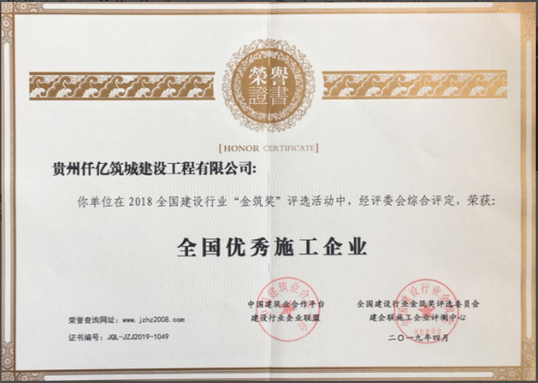 我公司在2018全国建设行业“金筑奖”评选活动中,经评委会综合评定,荣获:全国优秀施工企业。